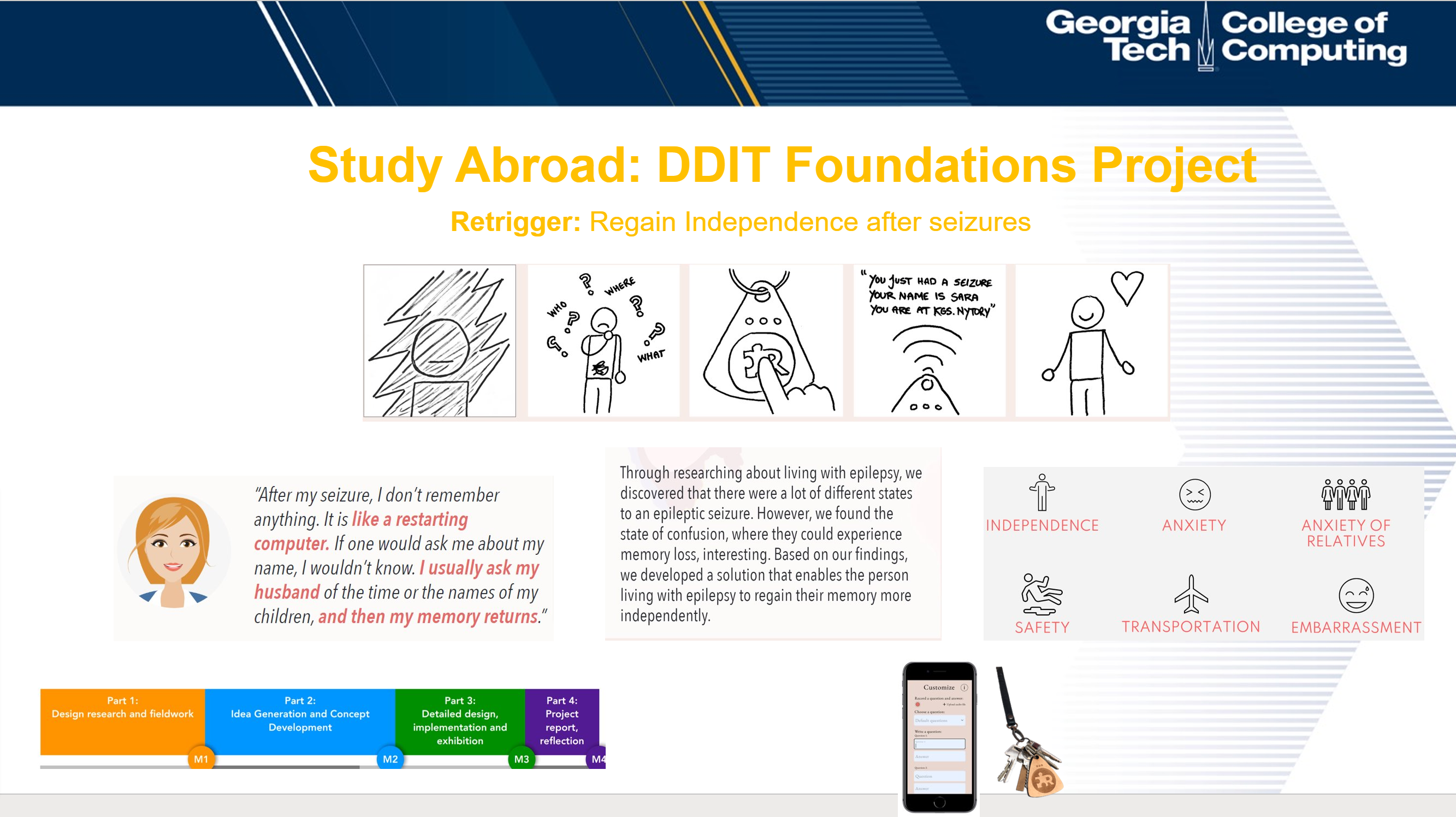 I worked on making digital posters for mass emails for college of computing faculty and students. At ITU Copenhagen, I worked with my teammates to analyze interviews and figure out what scope we wanted to focus on solving in their (people with epilepsy) lives. I also worked on design briefs as a group and creating a product video.